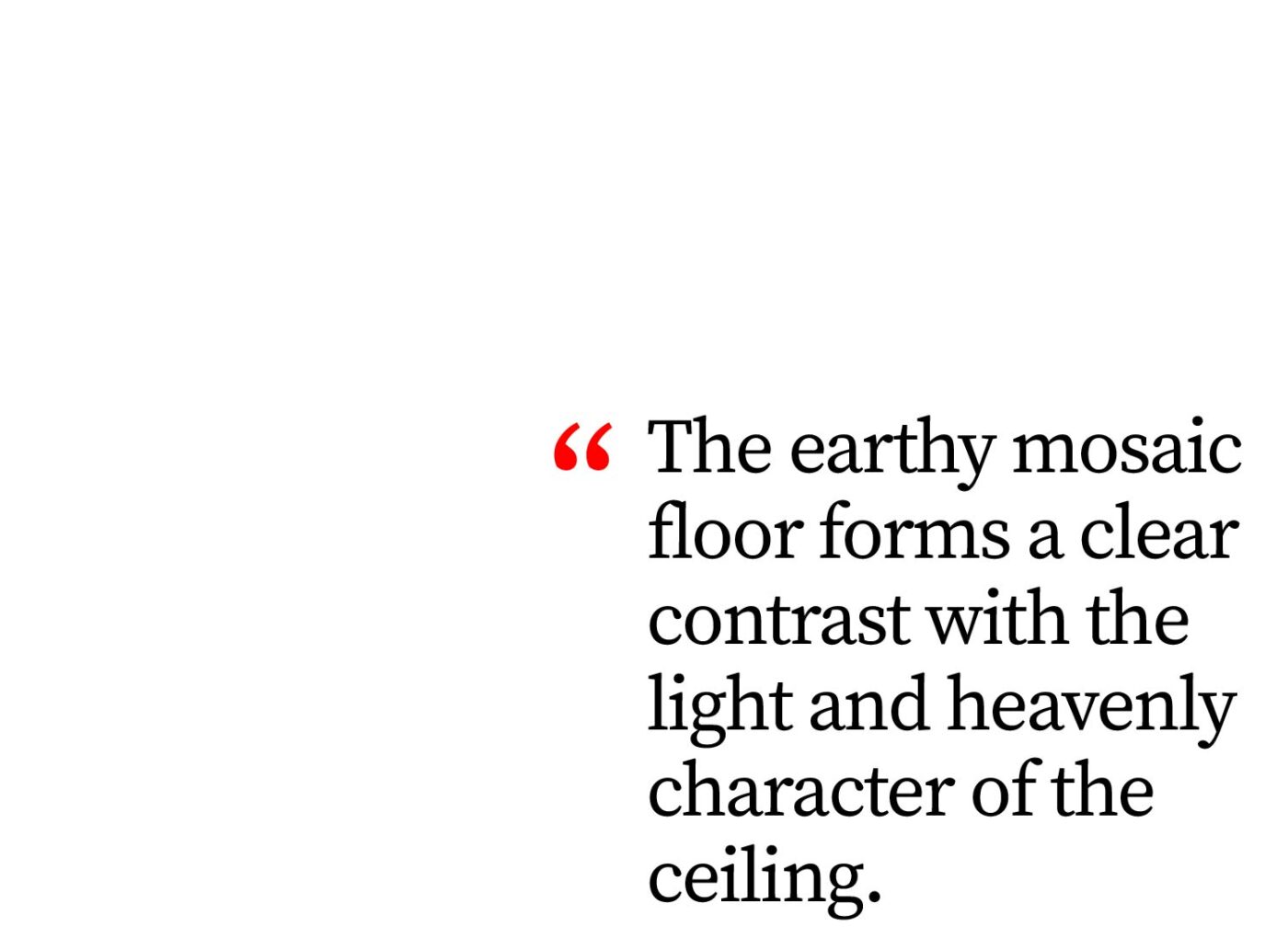 The shelter of a colonnade has been cut out over two floors from the buildings that border the courtyard garden. A tall space with a lively diagonal tile pattern. The multitude and multitude of colors symbolizes the diversity of people. The heavy nature of the floor connects the Colonnade to the earth and many footsteps taken by predecessors. An order is recognizable by a subtle grid of white tiles. The floor is therefore in clear contrast to the light and heavenly character of the ceiling. A radiant certainty and sign of hope like Giotto’s ultramarine in his Scrovegni Chapel with lighting on pendants.