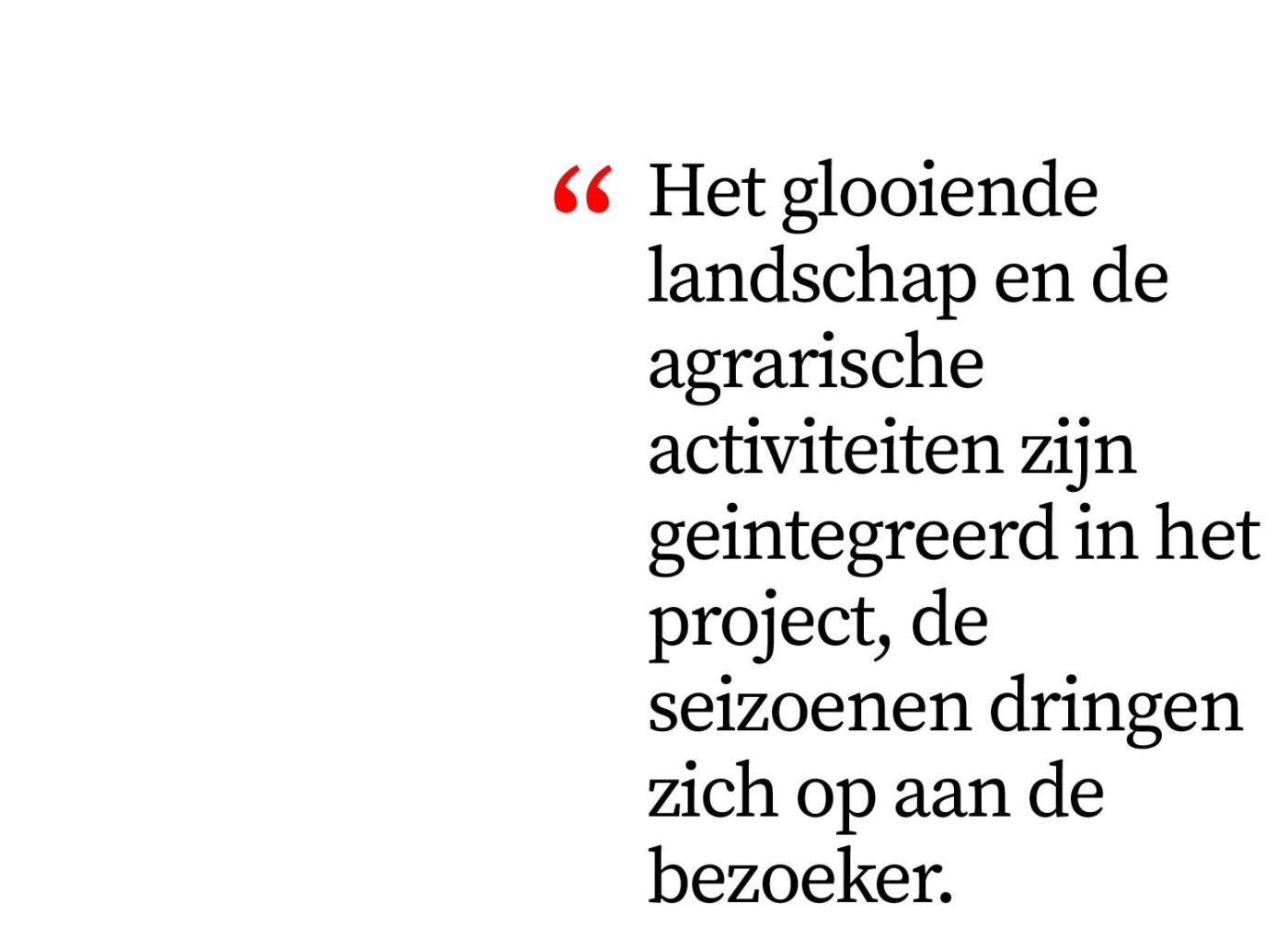 Het glooiende landschap en de agrarische activiteiten worden een integraal onderdeel van het project, de seizoenen dringen zich op aan de bezoeker. Het ontdekken van de omgeving wordt gezien als een geweldige kwaliteit en afstanden en leegtes die overbrugd een stimulans voor het welbevinden.
